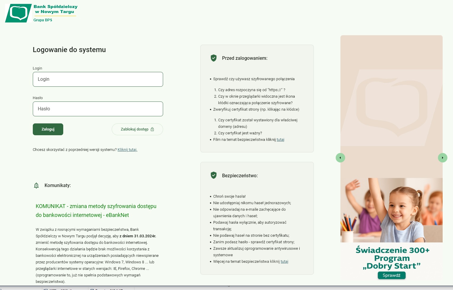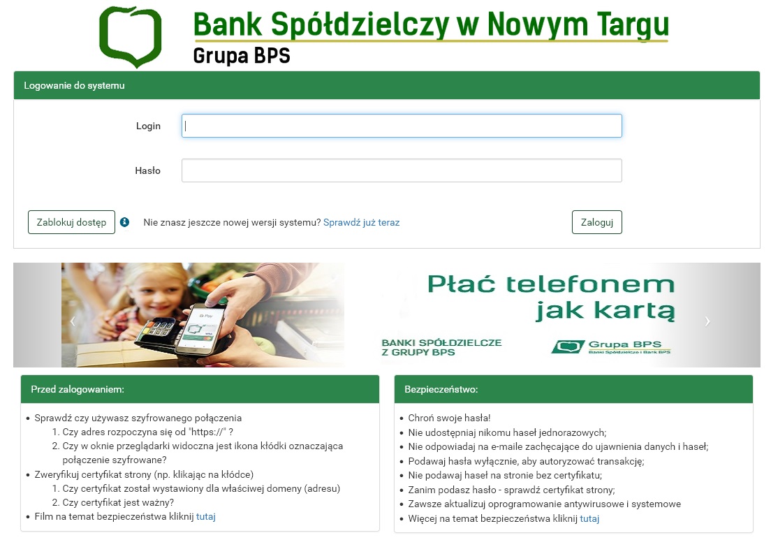 Zachęcamy do logowania do systemu bankowości elektronicznej za pomocą adresu nowej strony, która jest stroną docelową i rozwijaną pod względem nowych funkcjonalności i standardów. Stara strona wkrótce zostanie zamknięta.