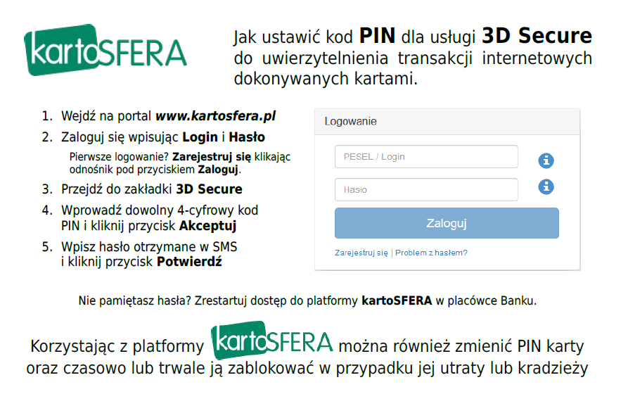 Aby dokonać płatności kartą przez internet, wymagane jest dodatkowe zabezpieczenie w postaci nowego kodu PIN (to nie jest kod do karty, którym potwierdzamy płatności w sklepach i bankomatach). Nowy kod można utworzyć tylko za pomocą portalu KartoSFERA a brak posiadania kodu PIN do transakcji internetowych uniemożliwia realizowanie płatności kartą dla transakcji internetowych.