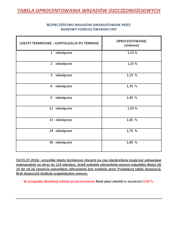 TABELA OPROCENTOWANIA WKŁADÓW OSZCZĘDNOŚCIOWYCH